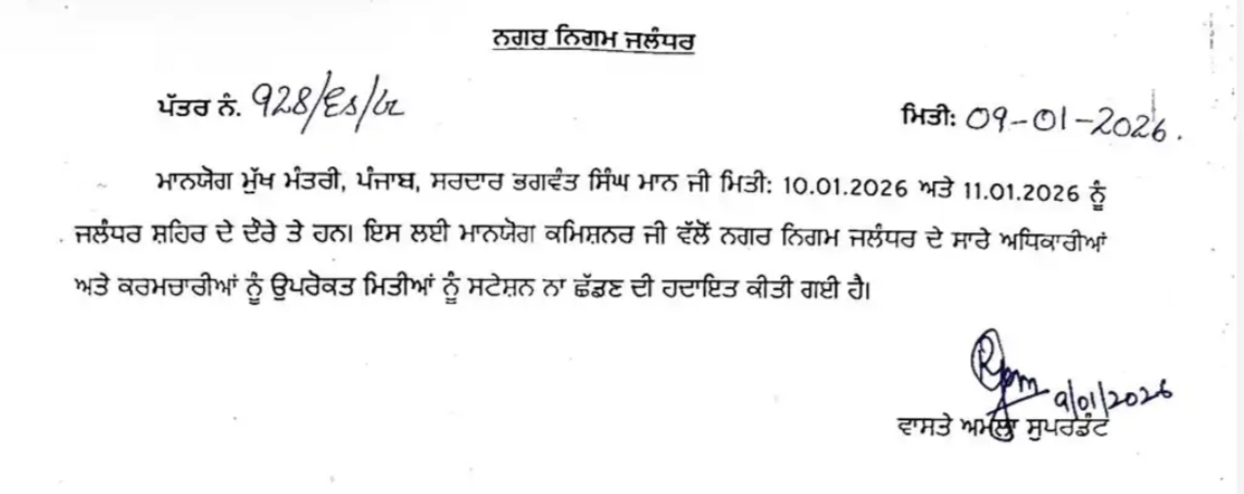 डीसी की तरफ से जारी निर्देशों में कहा गया है कि आज और कल नगर निगम (Municipal Corporation Jalandhar) के सभी अधिकारी और कर्मचारी स्टेशन नहीं छोड़ेंगे। आदेश में स्पष्ट किया गया है कि मुख्यमंत्री के दौरे के मद्देनजर प्रशासनिक व्यवस्थाओं को सुचारू बनाए रखने के लिए यह फैसला लिया गया है।