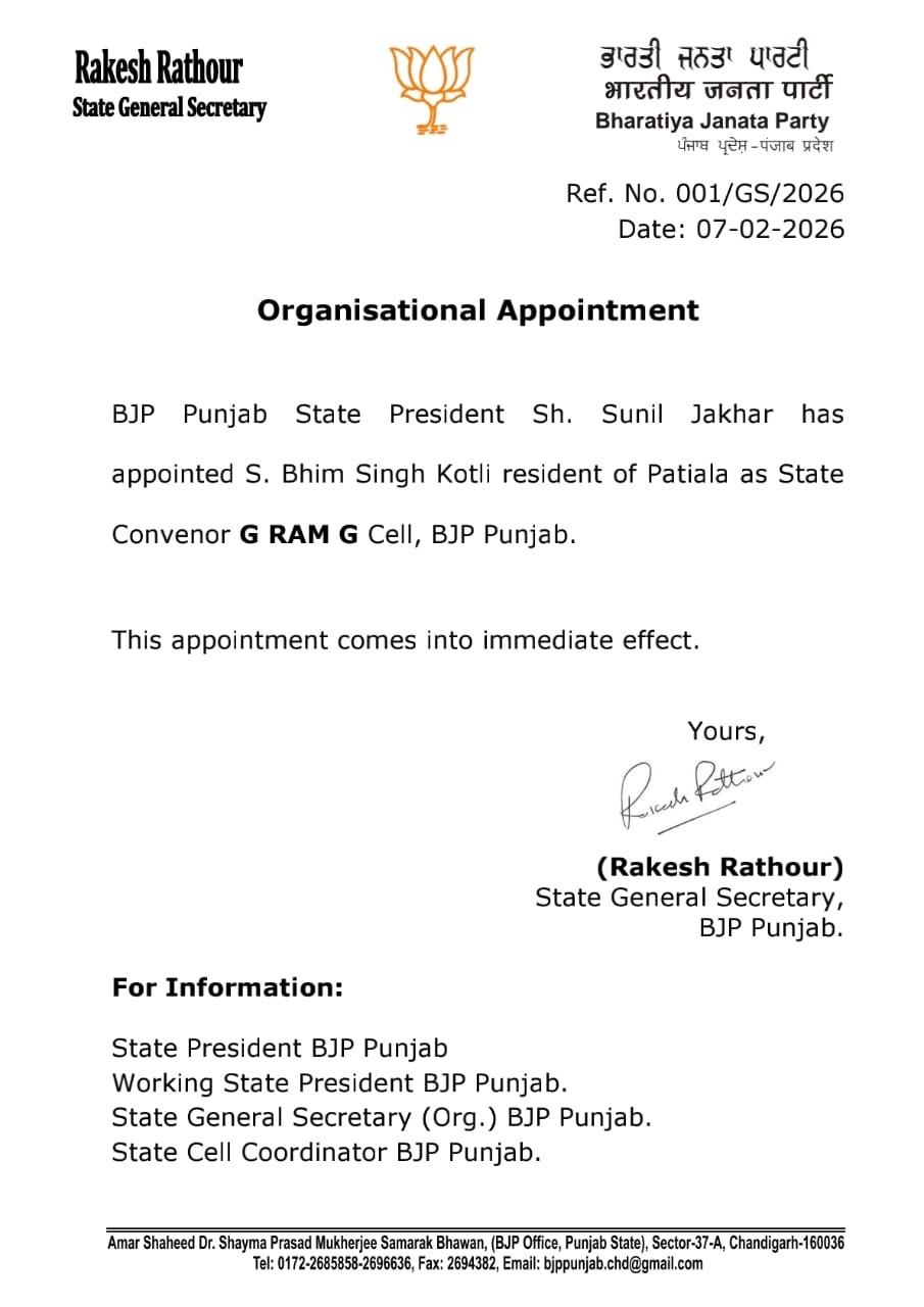 डेली संवाद, चंडीगढ़। Punjab News: भारतीय जनता पार्टी (BJP) पंजाब इकाई ने संगठन को और मजबूत करने की दिशा में दो अहम नियुक्तियों की घोषणा की है। ये नियुक्तियां पार्टी के प्रदेश अध्यक्ष सुनील जाखड़ द्वारा की गई हैं और इन्हें तत्काल प्रभाव से लागू कर दिया गया है। पार्टी महासचिव राकेश राठौर की ओर से जारी आधिकारिक पत्र के अनुसार, भीम सिंह कोटली को पंजाब BJP के जी राम जी सेल का संयोजक नियुक्त किया गया है, जबकि अश्वनी कुमार शर्मा को पार्टी के ट्रेड यूनियन सेल की जिम्मेदारी सौंपी गई है।