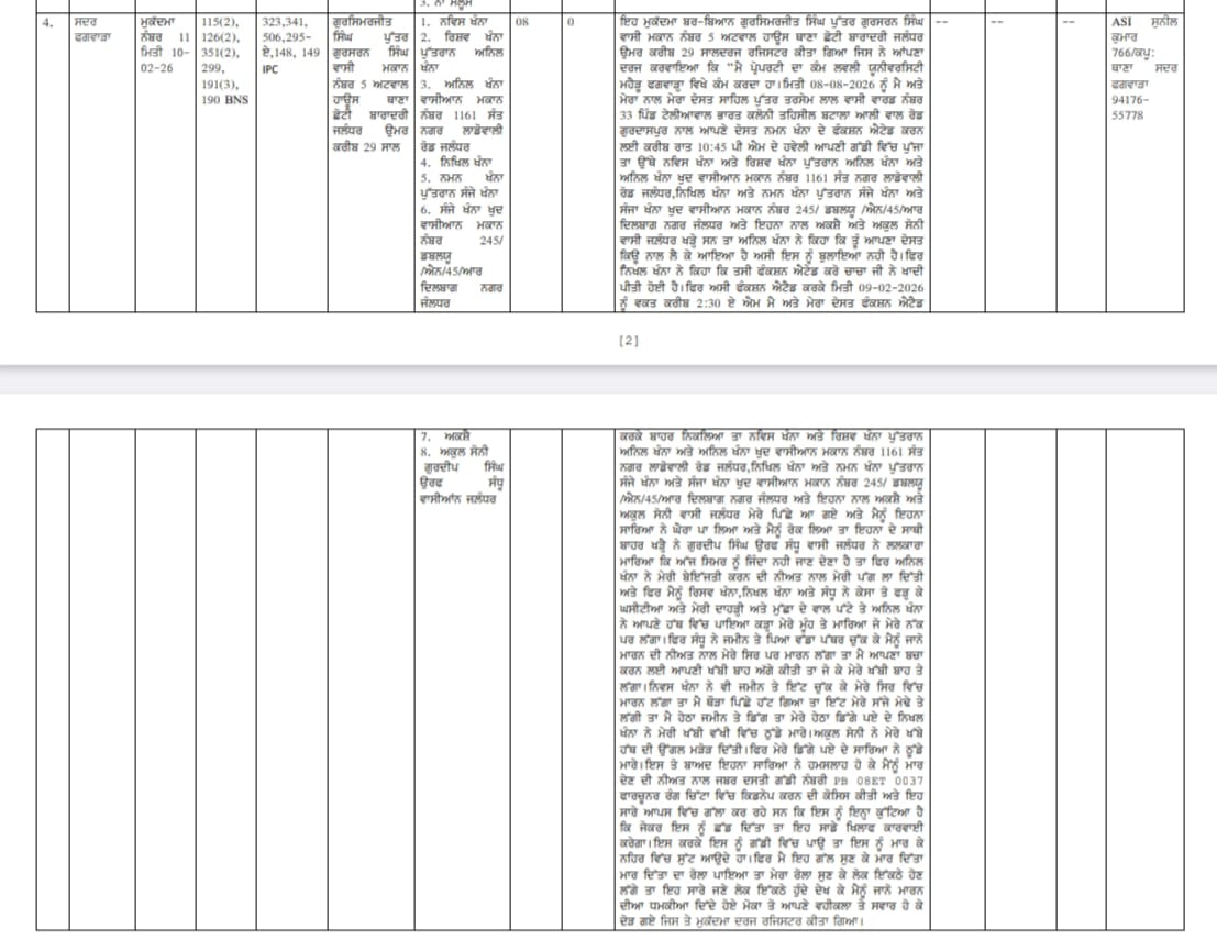 पीड़ित गुरसिमरजीत सिंह की शिकायत पर फगवाड़ा के सदर पुलिस थाने में मुकदमा नंबर 11 तारीख 10/02/2026 दर्ज किया गया। इसमें निखिल खन्ना, नमन खन्ना, संजय खन्ना (सभी निवासी दिलबाग नगर), अक्षय और अकुल सोनी समेत 9 लोगों के खिलाफ पुलिस ने  धारा 323, 341, 506, 295-ए, 148 और 149 में एफआईआर दर्ज की गई है।