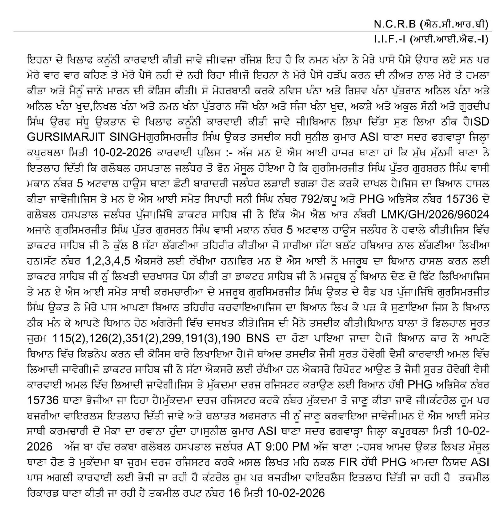 पीड़ित गुरसिमरजीत सिंह टक्कर की शिकायत पर थाना सदर फगवाड़ा में मुकदमा नंबर 11, तारीख 10/02/2026 को दर्ज किया गया। पुलिस ने निखिल खन्ना, नमन खन्ना, संजय खन्ना (सभी निवासी दिलबाग नगर), अक्षय सोनी और अकुल सोनी समेत कुल 9 नामजद आरोपियों के खिलाफ भारतीय दंड संहिता की धाराएं 323, 341, 506, 295-ए, 148 और 149 के तहत मामला दर्ज किया है। पुलिस सूत्रों के अनुसार मामले में धारा 307 (हत्या के प्रयास) सहित अन्य संबंधित गैर-जमानती धाराएं भी जोड़ी गई हैं।