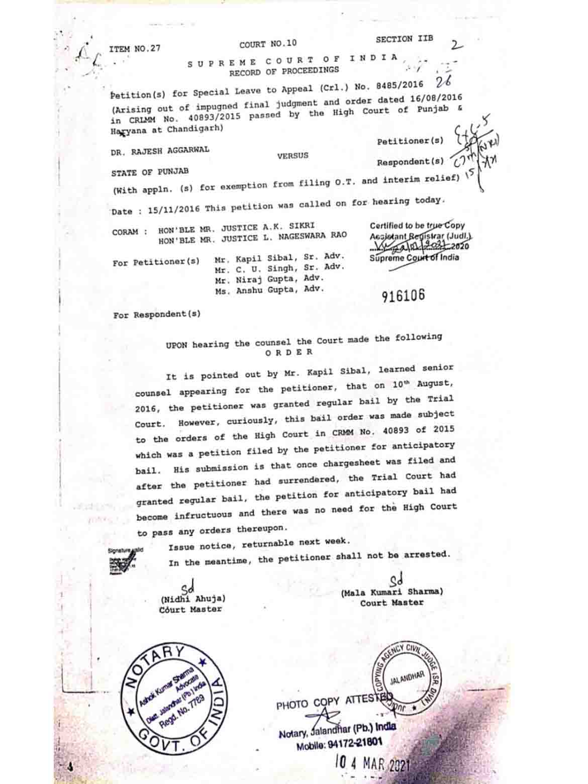 इसके बाद आरोपी डॉक्टर राजेश अग्रवाल ने सुप्रीम कोर्ट का रुख किया और अधिवक्ता कपिल सिब्बल ने सुप्रीम कोर्ट को बताया कि 10.8.2016 को ट्रायल कोर्ट ने राजेश अग्रवाल को रेगुलर बेल दे दी थी तो हाईकोर्ट में (CRM-M-40893 , 2025) में ख़ारिज की गई जमानत का कोई अर्थ नहीं रह जाता।